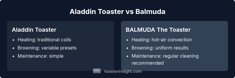 In the aladdin toaster vs balmuda comparison, Balmuda The Toaster generally delivers crisper, more uniform browning with a modern design, while the Aladdin Toaster remains a strong value choice with reliable performance and broad bread compatibility. For most homes, Balmuda suits toast enthusiasts who will pay a premium, whereas Aladdin offers solid results at a friendlier price. The aladdin toaster vs balmuda discussion highlights the trade-off between texture, price, and aesthetics.