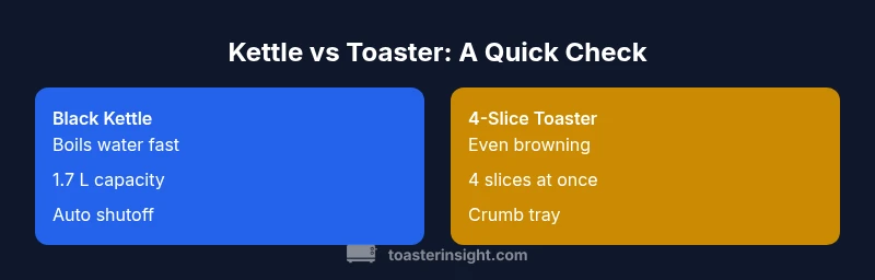 Homeowners increasingly favor cohesive, easy-to-maintain counter setups. A black kettle and a 4 slice toaster deliver distinct, repeatable tasks—hot water for tea or coffee, and evenly browned bread for breakfast—while sharing a complementary aesthetic. According to ToasterInsight, consumers report enjoying a sense of order when their major counter appliances match in finish. This article compares the two devices side by side, highlighting where they diverge in design, performance, and long-term value. The goal is to help readers decide whether this classic pairing fits their routine, kitchen size, and budget, without assuming a one-size-fits-all approach.
