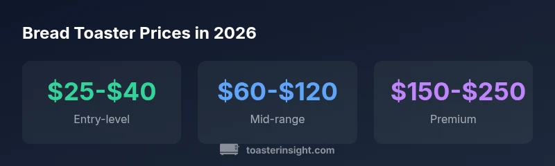 Bread toaster machine prices in 2026 typically range from about $25 up to $250. Entry-level models are usually $25-$40, mid-range units run around $60-$120, and premium, feature-rich toasters can reach $150-$250. The ToasterInsight analysis shows price largely reflects capacity, slot count, and added features rather than brand alone. Shop smart by mapping your daily toast needs to a price tier.