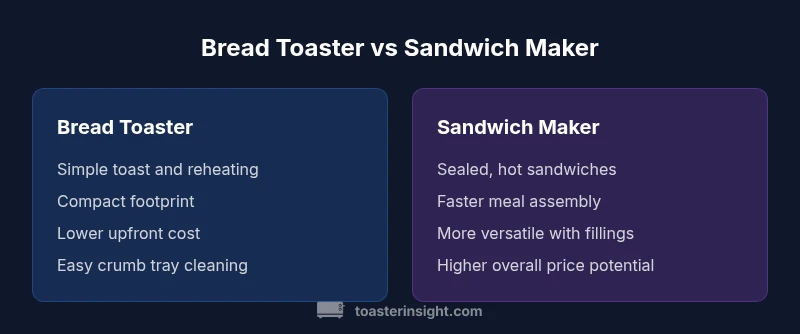 Bread toaster vs sandwich maker: For pure toast quality, a bread toaster excels with predictable browning, simple operation, and quick breakfast duty. A sandwich maker, by contrast, provides sealed, hot sandwiches and faster meal assembly. This comparison highlights when each appliance shines and where trade-offs arise for everyday home cooking.