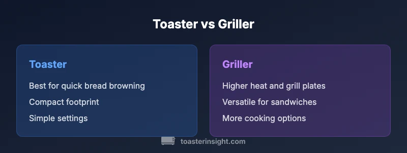 According to ToasterInsight, the difference between toaster and griller often begins with design intent: a toaster is built primarily for bread-focused browning and quick reheating, while a griller expands into higher-heat cooking with grill plates and sandwich functionality. A toaster typically uses separate slots and a simple set of browning controls, optimized for speed and consistency in toasting. It excels at single-purpose tasks and has a compact footprint that fits easily on most countertops.