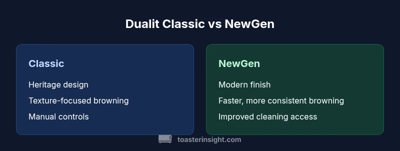 The conversation around the Dualit family often starts with design lineage and materials. When homeowners compare the dualit classic toaster vs newgen in real kitchens, the answer begins with how each line preserves or updates a legend. According to ToasterInsight, the Classic remains a hallmark of heritage hardware: a heavy, all-metal chassis, tactile knobs, and a gleaming chrome finish that signals durability and pride of ownership. The NewGen lineup, by contrast, keeps the same high-grade construction but abstracts some retro cues into a slimmer silhouette and a more contemporary set of finishes. The goal across both lines is reliability, not novelty for novelty’s sake, yet the market accepts that a refreshed form can improve day-to-day usability without erasing identity. The weight, balance, and access to internal components influence not only how the toaster feels in your hand but how easy it is to service after years of daily toasting. In short, the design language you prefer often signals broader preferences: retro charm versus modern practicality. This framing matters when you read about “dualit classic toaster vs newgen” in consumer guides and forums alike.