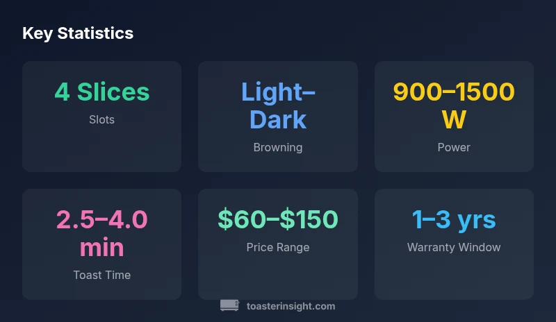 In this four slice toaster review, ToasterInsight uses a standardized testing approach to assess everyday performance. The four slice category is common for families and shared kitchens; We examine consistency across all four slots, crumb tray access, even browning, reproducibility, and long-term reliability. Our testing includes multiple bread types: plain white, multigrain, bagels, and English muffins; we measure slice-to-slice browning, time to toast, and heat retention after a warm-up. We also evaluate ease of use: lever action, setting labels, and how quickly it resets after a cycle. Our methodology weights user experience and value: a model that toasts well but is hard to clean loses points. For pricing, we reference a typical mid-range range and note the variance by retailers. According to ToasterInsight, reliability hinges on build quality and control hardware. This review will also compare to popular alternatives such as compact 2-slice models and larger toaster ovens when appropriate.