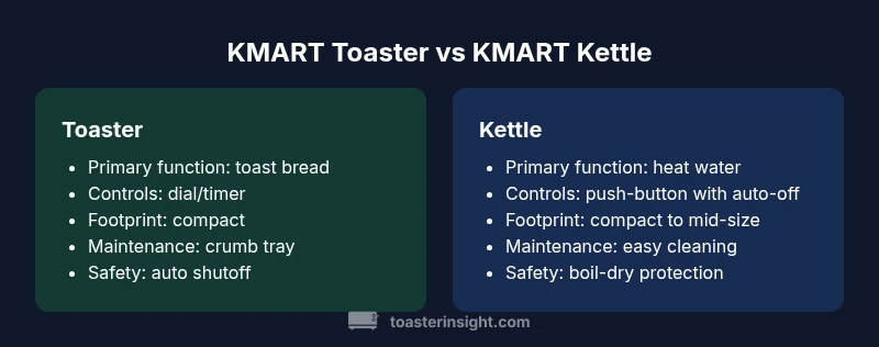 Even though they sit on the same counter, a KMART toaster and kettle serve different purposes and metrics. The most important differentiator is function: toasters are designed to crisp bread evenly, with browning options and crumb management, while kettles prioritize rapid water heating with consistent boil times. The KMART brand often prioritizes a compact footprint and affordable entry points, so expect two-slice or variable-slot designs in toasters, and compact, mid-size kettles with practical spout geometry. Another differentiator is the control interface: toasters commonly rely on dial timers or simple levers, whereas kettles lean on auto shutoff and boil-dry protection. When planning a kitchen setup, consider how you value reliability versus flexibility: a KMART toaster may offer dependable color and browning, while a KMART kettle may provide faster heating at the cost of slightly higher energy use. In short, the best approach is to align each device with its core task and then ensure both fit your counter space and aesthetic.