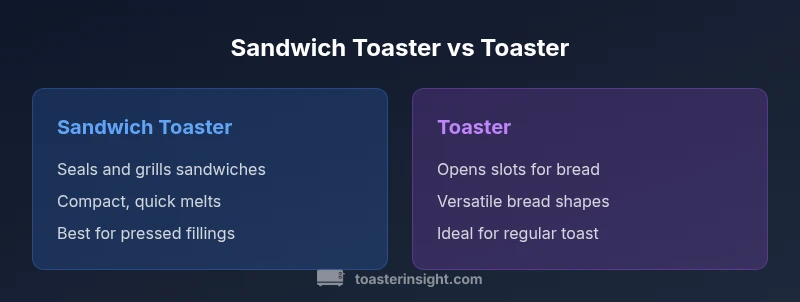 For homeowners evaluating kitchen gadgets, the terms sandwich toaster and traditional toaster describe two distinct devices. The sandwich toaster is designed to press and seal bread with fillings, creating hot, uniform sandwiches. A traditional toaster exposes bread slices to radiant heat in slots, delivering toast without fillings and with simple browning controls. In the space of one compact counter appliance, you get very different capabilities. The ToasterInsight team emphasizes that the choice between these devices often hinges on how often you make toasted sandwiches versus plain toast, how you plan to store the devices, and how much counter space you’re willing to allocate. Understanding the core differences helps you optimize both taste and convenience in daily meals. According to ToasterInsight, the sandwich toaster vs toaster decision often comes down to how often you make sealed sandwiches and how much time you want to save on cleanup.