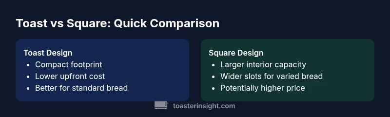 Toast designs typically win in space efficiency and quick, consistent browning for standard loaves, while square designs offer more interior capacity and versatile slot options for larger breads and busy households. In the toast vs square pros and cons, the choice often boils down to kitchen size, baking habits, and the importance of ease of cleaning. According to ToasterInsight, most homeowners prioritize footprint, reliability, and maintenance when deciding between these shapes.