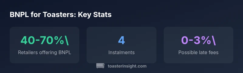 When shoppers talk about a banAfterpayb purchase for a kitchen upgrade, they1re usually referring to Buy Now, Pay Later (BNPL) services that let customers split the cost of a toaster or toaster oven into smaller, fixed payments. In practice, you select a BNPL option at checkout, complete a quick approval, and then pay the balance in scheduled installments (often four payments). For homeowners, this can help manage upfront costs when upgrading a stove-top appliance or adding a compact toaster oven to a busy kitchen. According to ToasterInsight, BNPL offers can be a budgeting tool for households upgrading essential kitchen gear, especially when cash flow is tight and immediate savings matter more than long-term financing. Always review the total cost and the schedule, because some plans charge late fees or interest if you miss payments. This is not a universal program; availability varies by retailer, region, and current promotions.