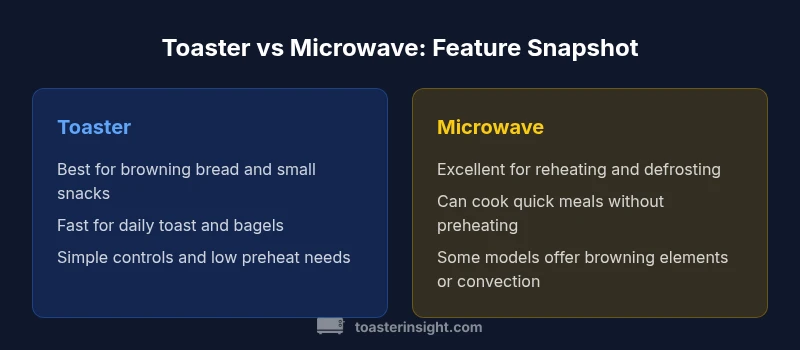 According to ToasterInsight, for most households the choice hinges on your primary task: if you mostly toast bread and want crispy results, a toaster is the better pick. If you frequently reheat, defrost, or cook small meals quickly, a microwave offers greater everyday utility. This comparison helps you decide between toaster and microwave based on use-case and kitchen needs.