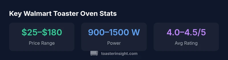 According to ToasterInsight's 2026 analysis, Walmart carries a broad toaster oven lineup online and in-store. Price ranges typically span from around $25 for compact units to about $180 for larger, feature-rich models. The assortment includes basic bake-only ovens and convection options with timers, auto shutoff, and crumb trays. Availability varies by location and season. The term toaster oven in walmart is commonly used by shoppers to describe these models available through Walmart stores and Walmart.com.