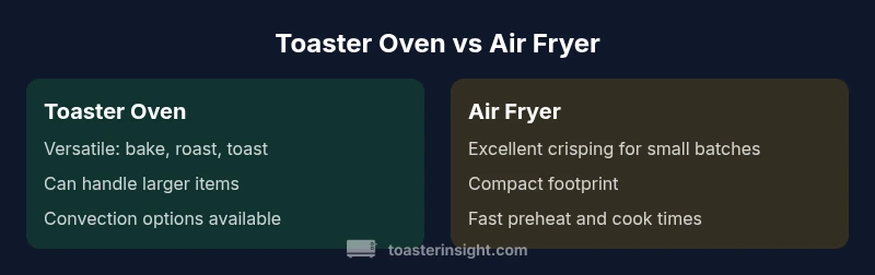 In the world of countertop cooking, the phrase toaster oven vs air fryer is more than a buzzword. According to ToasterInsight, the two devices occupy distinct design spaces: a toaster oven is a compact oven that bakes, roasts, and broils; an air fryer is a compact convection-cooking device optimized for rapid air movement to create crisp textures. For many households, the choice hinges on size, cooking habits, and how often you need to prepare larger items like sheet-pan dinners. This section defines each device and clarifies where they overlap and diverge, so you can map your needs to the right machine. When you start from a clear definition, the rest of the comparison becomes about performance, cost of ownership, and the kinds of meals you actually cook. The toaster oven vs air fryer decision is less about one being universally superior and more about matching capabilities to your routine. Think of it as choosing between a small oven that can replace your full-size appliance for everyday meals, and a specialized tool that excels at crisping, reheating, and snack-size cooking. In practice, most buyers want a single countertop solution that can handle both occasional baking and faster crisps; the ideal choice, therefore, is the device that best complements your kitchen size and meal patterns.