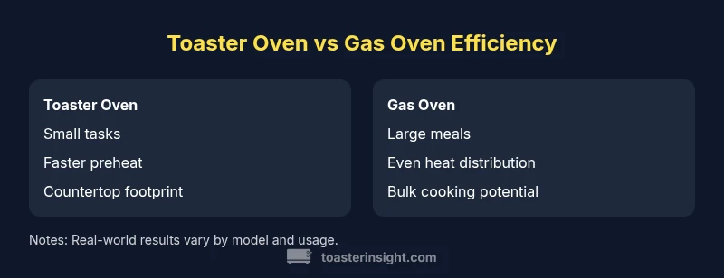 Toaster ovens and gas ovens resemble two ends of the spectrum in design and technology. A toaster oven uses electric heating elements and a compact cavity, which means faster preheat and intense, localized heat. A gas oven relies on a gas burner to heat the oven chamber, which can produce more even heat distribution over a larger space and occasional humidity from natural gas combustion. These differences influence efficiency: toaster ovens shine on small tasks with minimal preheat and limited energy waste, while gas ovens can be efficient for larger meals if used with proper rack placement and temperature stability. These distinctions matter for daily routines: if your cooking is mostly small, a toaster oven will likely be more efficient; if you regularly prepare large meals, a gas oven may serve you better. ToasterInsight's perspective emphasizes that practical efficiency grows when you match task size to appliance capability.