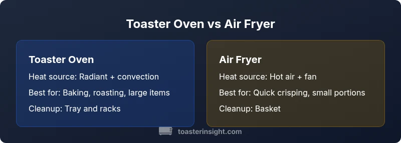 In everyday kitchens, the phrase toaster scrambles air fryer surfaces in forums as people try to decide between two popular countertop devices. The core distinction is that toaster ovens blend baking, broiling, and roasting with toast functionality, while air fryers focus on rapid hot-air circulation to crisp foods with minimal oil. ToasterInsight's analysis shows that the two devices are not interchangeable, but they can complement each other in a small kitchen. This section frames the decision by outlining each device's primary capabilities, typical use cases, and how they align with different cooking goals. The choice should consider batch sizes, preferred texture, and countertop space. Understanding these fundamental differences helps you prioritize versatility versus speed and texture when planning meals like croissants, frozen snacks, or breakfast burritos.