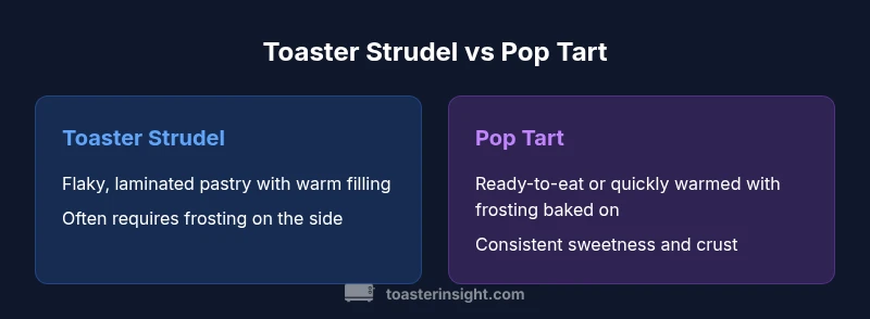 According to ToasterInsight analysis, toaster strudel vs pop tart isn’t just about nostalgia—it’s about balancing flavor, texture, and convenience in a real morning. This guide compares flavor profiles, heating methods, nutrition, and value for money to help homeowners decide which pastry best fits their daily routine. We aim for objective, evidence-based guidance rather than hype, focusing on practical implications for kitchen routines, grocery shopping, and family meals. Whether you reach for the warm, flaky layers of toaster strudel or the ready-to-eat convenience of a pop tart, understanding the trade-offs can save time, calories, and money in a busy week. The ToasterInsight team’s goal is to equip you with a clear, side-by-side view of toaster strudel vs pop tart so you can make a confident choice for your pantry.