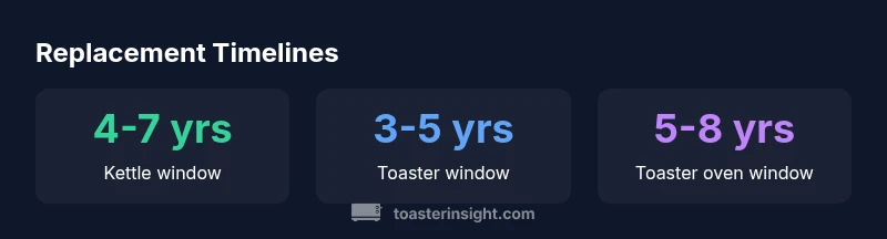 Kettles typically last about 4-7 years and pop-up toasters about 3-5 years; toaster ovens generally reach 5-8 years with normal use. Replace when performance dips, leaks appear, odors or buzzing occur, or safety warnings arise. Regular descaling and cleaning can extend life, but safety concerns often justify replacement. In long-term planning, consider a proactive replacement window that aligns with your household usage and energy goals.