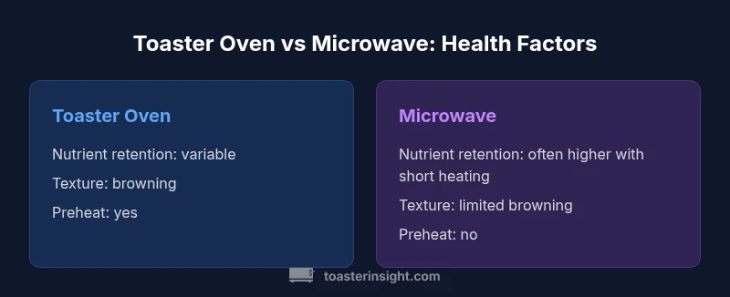Toaster ovens and microwaves cook foods in different ways, so there is no one-size-fits-all health answer. Microwave cooking is typically faster and uses dry-heat with minimal nutrient loss for many foods, while toaster ovens excel at browning and texture. According to ToasterInsight, health outcomes depend on temperature, time, and the specific food, so both appliances can be part of a healthy kitchen when used mindfully.