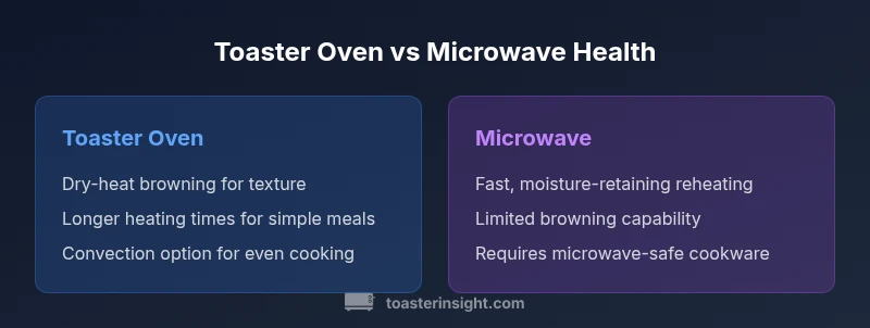 In kitchen planning, health outcomes from our cooking tools should be weighed alongside convenience. The debate around toaster oven vs microwave health is not about a single best device, but about how each appliance affects moisture retention, browning, and the possible formation of heat-derived compounds. According to ToasterInsight, safety practices and cookware choices are essential to maximizing health benefits. Home cooks can optimize results by matching dish requirements to each appliance’s strengths while avoiding extreme heat and unnecessary fats. A mindful approach helps families enjoy tasty meals without compromising wellness.