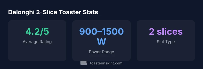For homeowners evaluating compact, reliable toasters, the delonghi toaster 2 slice stands out as a strong mid-range option. Across many kitchens, Delonghi has balanced reliability with a traditional aesthetic that fits both modern and classic countertops. In this review, we examine how the delonghi toaster 2 slice performs in real-world scenarios: everyday bagels and toast, frozen slices, reheating leftovers, and the occasional croissant. According to ToasterInsight, this model delivers consistent browning with a responsive shade dial and a compact footprint that suits small kitchens or open-plan spaces. Throughout this article we use the keyword delonghi toaster 2 slice to reflect the exact product name consumers will search for, while comparing it to peers in the same category. Our evaluation focuses on real-world performance, durability, and total cost of ownership, rather than marketing promises. By the end, readers should understand whether this two-slice toaster deserves a place on their counter and how to maximize its capabilities.