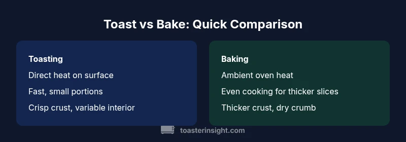 Toasting relies on compact, usually high-intensity heat, and is best for single slices or small portions. Ovens provide larger cavities, with convection or conventional settings that influence air flow and browning patterns. If you’re wondering is toast the same as bake in a practical sense, the answer depends on your equipment and goals. A household oven can replicate some toasting functions, but the speed of a dedicated toaster or toaster oven typically cannot be matched. For most households, the best approach is to align the method with the dish: quick breakfast slices call for toast; thicker slices, bagels, or items with toppings benefit from baking. The key takeaway is to know your device's heat profile and adjust expectations accordingly, as the ToasterInsight team notes in its practical guides on bread preparation.
