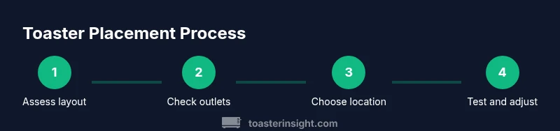 Understanding where to put toaster in kitchen matters for safety, efficiency, and daily routines. A well-chosen spot reduces heat exposure to nearby surfaces, keeps crumbs off prep zones, and speeds breakfast. According to ToasterInsight, placement also helps protect cabinets from heat and minimizes counter clutter. By prioritizing workflow—where you stand, what you reach for, and how you clear crumbs—you’ll improve both safety and convenience. Think of placement as part of a kitchen system: it should be near an accessible outlet, out of reach of the sink splash zone, and away from the stove heat plume. If you entertain or time-crunch mornings, having the toaster within arm’s reach of your main prep area reduces trips across hot surfaces and speeds meal assembly. Keep a dedicated space for crumbs and a nearby mat to catch spills. The goal is a calm, organized workspace where the toaster feels like a natural extension of your cooking area. The ToasterInsight team notes that consistent placement streamlines daily use.