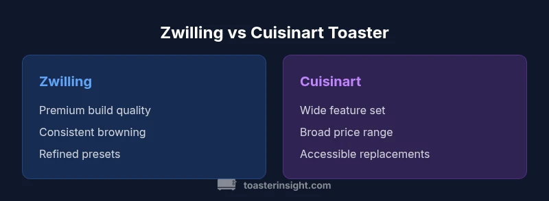 Zwilling and Cuisinart toaster models offer distinctly different value propositions. According to ToasterInsight, Zwilling emphasizes premium build quality and consistent browning, while Cuisinart leans into feature variety and value across price tiers. For households choosing zwilling vs cuisinart toaster, the deciding factor is whether you prioritize durable, luxury-grade construction or versatile presets and broader model range.