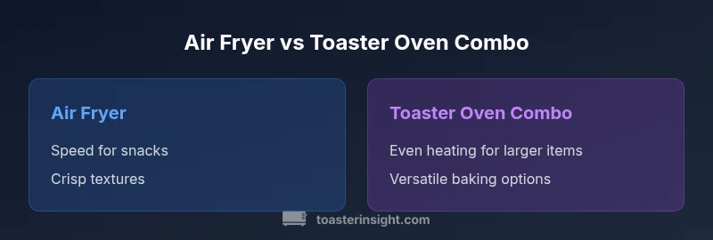 An air fryer vs toaster oven combo is a single appliance that blends the hot-air convection cooking of an air fryer with the traditional baking, toasting, and roasting capabilities of a toaster oven. In practice, you’ll find two main flavors: (1) a compact unit marketed as an air fryer with toaster-oven functions, and (2) a larger, multi-mode appliance that includes dedicated air-frying baskets and traditional rack access. For homeowners evaluating these devices, the decision often hinges on space, intended cooking tasks, and how much you value crisp, fast results alongside baking versatility. ToasterInsight finds that most households consider a combo when countertop real estate is tight and the goal is a single workhorse for both quick bites and everyday meals.