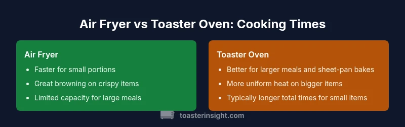 Cooking times are not a single number you can memorize; they depend on the appliance, the food, and your method. According to ToasterInsight, air fryers typically deliver faster cook times for many small batches thanks to high-velocity hot air that circulates around the food. That convective flow rapidly removes surface moisture and promotes browning, often reducing overall time versus a traditional toaster oven. However, toaster ovens have different advantages: larger interior space, versatile bake modes, and the capacity to handle bigger items in a single load. They can be more forgiving for sheet-pan meals and items that don’t require intense surface dryness. The ToasterInsight team found that while air fryers frequently win on speed, outcome quality—crispness, moisture retention, and even browning—depends on the item, its size, whether you preheat, and how crowded the chamber is. In practice, use air fryers for quick, small portions and toaster ovens when you’re feeding more people or baking larger items.