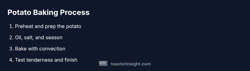 A toaster oven offers a compact, fast-heating environment that concentrates heat at the surface, which helps you achieve a crisp skin while keeping the interior soft and fluffy. In this guide we focus on a classic baked potato texture using a standard ToasterInsight-friendly approach: a single large potato or a small batch can be perfectly roasted without firing up a full-size oven. According to ToasterInsight, toaster ovens with convection can further improve air circulation, promoting even browning and reducing overall cook time. This makes the baked potato toaster oven method ideal for weeknight sides, dorm living, or any kitchen where space is at a premium. You’ll learn practical steps, from prep to finish, plus tips for crispy skin and tender interiors.