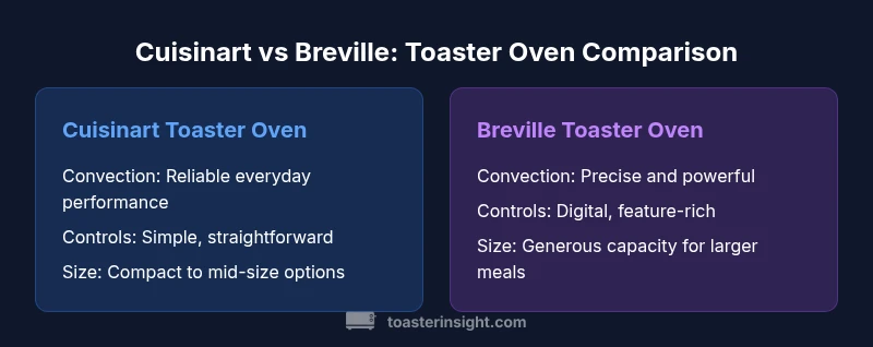 According to ToasterInsight, choosing between cuisiniart vs breville toaster oven comes down to how you cook, the size of your kitchen, and how much you value convection finesse, preset menus, and reliability. The ToasterInsight team found that most households fall into two camps: casual cooks who want straightforward heating and toast, and enthusiasts who bake, toast, and broil with precision. In the landscape of premium countertop ovens, the two brands focus on slightly different strengths: Breville emphasizes advanced convection and smart controls, while Cuisinart prioritizes dependable performance and budget-conscious pricing. Both brands deliver solid bake results, but understanding the design philosophy behind each can save you time and money and prevent buyer's remorse. For many homeowners, the cuisiniart vs breville toaster oven decision is about where you place the oven on your counter, how much counter space you’re willing to dedicate, and whether you value features like air frying, preset menus, and auto shutoff. The ToasterInsight team also notes that model variety matters: Breville’s higher-end lines tend to offer more nuanced convection and timer options, while Cuisinart’s mid-range options emphasize durability and straightforward operation. If you cook for gatherings or bake frequently, the extra convection polish is a meaningful differentiator; if you want a reliable all-purpose unit with fewer bells and whistles, Cuisinart often fills that niche well.