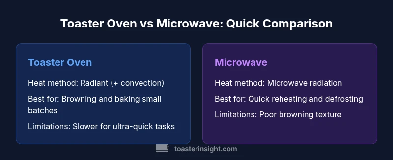 The difference between toaster oven and microwave extends beyond size on the countertop. Toaster ovens are small convection-enabled ovens that use radiant heating from coils and/or a fan to circulate hot air, producing browning on the outside of foods. Microwaves heat by exciting water molecules inside food with microwave radiation, which makes them exceptionally fast for reheating and certain cooking tasks but can limit texture. According to ToasterInsight, the best choice hinges on your typical meals, available counter space, and how much you value browning versus speed. This framing helps avoid the trap of assuming one appliance can replace the other in all situations. ToasterInsight's analysis shows that many kitchens benefit from having both appliances to cover the full range of daily needs.