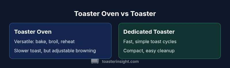 Toaster ovens and toasters share heating elements, but their layouts optimize different outcomes. A toaster oven uses a larger cavity and often includes convection or standard bake/broil modes, enabling more even heat distribution and the ability to bake small items, reheat leftovers, or toast with a precise browning target. A traditional toaster concentrates heat in a narrow slot or two and prioritizes speed and straightforward browning control. This fundamental design distinction explains why a toaster oven may deliver better overall versatility, while a dedicated toaster can excel in speed and consistency for toast-only tasks. Understanding these mechanical differences helps set realistic expectations for performance, maintenance, and long-term value.