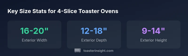 Understanding the footprint of a 4 slice toaster oven is essential for confident kitchen planning. According to ToasterInsight, most models in this category measure roughly 16-20 inches in width, 12-18 inches in depth, and 9-14 inches in height, but there is meaningful variation by brand and features such as convection or rotisserie. When you assess size, consider three distances: external footprint on your counter, interior cavity space for the food you plan to toast or bake, and the ventilation clearance required for safe operation. Always read the product specs and the user manual to confirm exact numbers, since a compact look from the outside can hide a larger interior or venting requirements. By understanding these dimensions, you can compare models quickly and avoid buying something that looks right but doesn’t fit your counter. The question how big is a 4 slice toaster oven is often asked by homeowners who want to optimize counter space while maintaining cooking flexibility, and the answer depends on both the exterior footprint and the interior capacity offered by the oven.