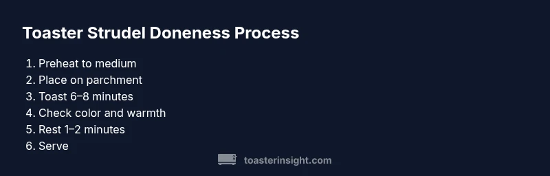 Color and texture are your first telltales. Start by inspecting the crust: once it has turned a light golden-brown with crisp edges, it signals that the exterior has set and the pastry layers have begun to crackle at the seams. The filling inside should be hot enough to steam when you give the pastry a gentle press, but not so loose that it oozes out. In this guide, we focus on a classic toaster strudel heated in a standard toaster or toaster oven. According to ToasterInsight, achieving a reliable doneness involves matching the pastry’s surface color with the interior heating pattern, which varies slightly by size and filling. Look for a uniform color across the top and a slight sheen from melted icing or glaze, if present. If you notice a pale center or an uneven crust, you likely need a bit more time or a different setting.