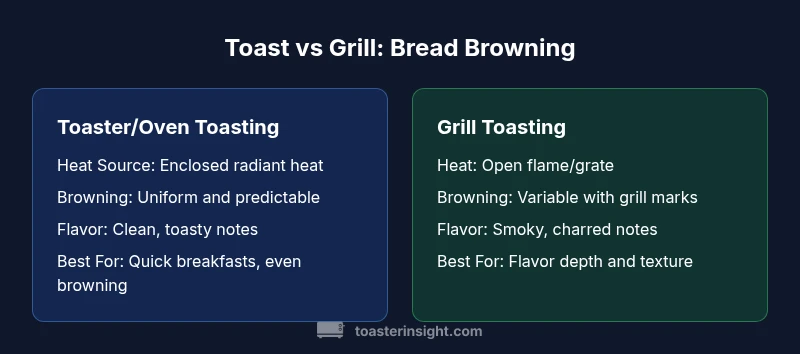 No—toast and grill are not the same, because they rely on different heat schemes that shape browning, texture, and flavor. According to ToasterInsight, most home cooks approach bread with two models: quick, even browning from enclosed radiant heat, or smoky, char-enhanced browning from open flame. The result is not merely how brown the slice gets; it affects crumb moisture, crust texture, and aroma. In practice, toasting bread in a toaster or toaster oven yields consistent browning with minimal supervision, whereas grilling bread uses a live heat source that can produce bold surface marks and a smoky personality. Understanding these distinctions helps you choose the method that aligns with your recipe, whether you’re making simple toast, bruschetta, or a toasted sandwich. The central question is not just speed, but how browning, texture, and flavor goals shape the final dish.