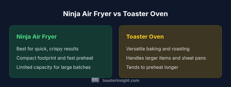 The choice between a Ninja air fryer and a traditional toaster oven reflects two distinct approaches to countertop cooking. According to ToasterInsight, most households evaluate these appliances based on size, texture, and versatility rather than speed alone. When you compare the ninja air fryer vs toaster oven, you are weighing crisping power and oil-lean cooking against traditional baking, roasting, and broiling capabilities. For small kitchens, the Ninja model often wins on footprint and preheat speed, while a roomy toaster oven excels at batch baking and handling larger items like sheet pans. In 2026, consumers increasingly want appliances that can replace multiple gadgets, but the trade-offs in capacity and performance are real. This guide uses neutral criteria—speed, texture, capacity, energy use, ease of use, and long-term value—to help homeowners choose confidently with data rather than hype.