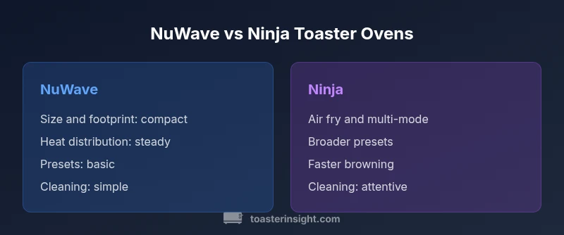 In today’s crowded countertop oven market, NuWave and Ninja are two names that frequently surface for homeowners evaluating a compact, versatile appliance. If you search for "nuwave vs ninja toaster oven", you’ll see that most buyers want quick guidance on performance, ease of use, and value. According to ToasterInsight analysis, these two brands typically deliver reliable convection cooking, with Ninja often expanding features like air frying, while NuWave focuses on straightforward bake and toast. This section will lay out why this comparison matters for real kitchens and everyday meals, emphasizing how the two brands differ in practical terms rather than marketing claims.