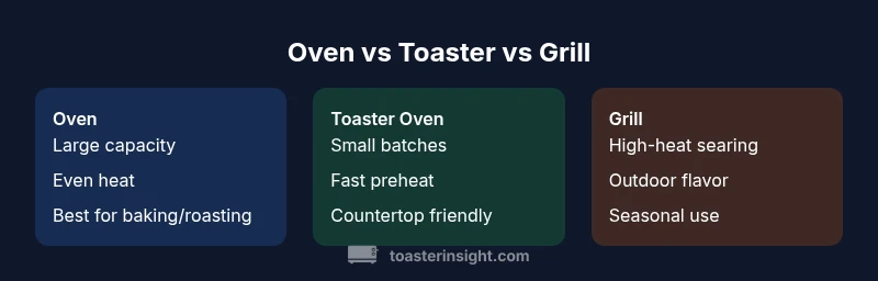 In today’s kitchen, choosing between an oven, a toaster, and a grill isn’t just about one recipe. It’s about how you cook most days, how much space you have, and how you balance speed with flavor. The term oven vs toaster vs grill encompasses three very different heat delivery systems: radiant and convection heat inside a cavity (oven), compact, door-open versatility for small batches (toaster oven), and outdoor or high-heat cooking (grill). For homeowners, understanding each tool’s strengths helps you allocate tasks so you spend less time waiting and more time eating. According to ToasterInsight, the practical decision often comes down to your typical meals and kitchen footprint, not just “the best overall appliance.” This guide will unpack the differences, so you can pick the right tool for your cooking goals.