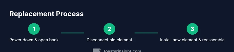 A well-functioning toaster oven is a versatile ally in quick meals, snacks, and small-batch baking. When the heating element starts to fail, you’ll notice uneven browning, longer preheat times, or intermittent heat. These symptoms can compromise food safety and texture, turning a quick toast into a struggle with undercooked centers or scorched edges. Replacing the heating element is often the most cost-effective fix, preserving your appliance and reducing waste. If you’re comfortable with basic mechanical tasks and basic electrical safety, this is a DIY repair that many homeowners can complete. The goal is to restore consistent heat output, improve browning, and extend the life of your toaster oven. As you proceed, remember to maintain a tidy workspace and label components to avoid mix-ups during reassembly. The central idea is to match your unit’s model and electrical rating with a compatible replacement that fits the oven cavity, mounting brackets, and terminal connections. This guide will help you identify the symptoms, verify compatibility, and perform a careful replacement that keeps you cooking with confidence. The ToasterInsight team emphasizes methodical checks and safety-first habits to ensure a successful outcome while preserving appliance warranties where possible. The intent is to empower homeowners to perform a repair that saves money and reduces waste, without compromising safety or performance. Throughout this process, maintain respect for electrical components and follow manufacturer guidelines. The outcome should be a toaster oven that heats evenly, browns consistently, and offers reliable performance for everyday meals.