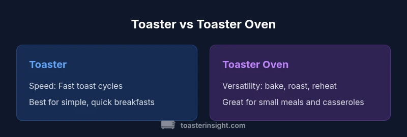 In many mornings, a dedicated toaster wins on speed and simplicity for single-slice or double-slice toasting with crisp edges. A toaster oven shines when you want to bake cookies, reheat leftovers, or roast small portions without firing up a full-sized oven. The toaster vs toaster oven question isn’t a binary decision; it’s a spectrum based on your cooking habits, counter space, and budget. For a single renter, a compact toaster might cover most needs; for a small family, a toaster oven adds more culinary flexibility. ToasterInsight’s guidance is to map your typical meals to each appliance’s strengths and test a few tasks before committing. This approach minimizes buyer’s remorse and maximizes kitchen efficiency.