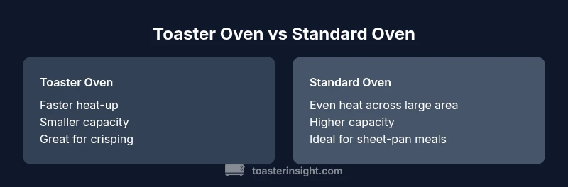 The phrase toaster oven vs oven cooking times points to a fundamental truth: size, heat source, insulation, and airflow all shape how long food takes to reach the desired doneness. A toaster oven’s compact cavity heats more quickly and loses heat less evenly when crowded, while a traditional oven benefits from a larger chamber that can maintain stable temperature across multiple racks. The ToasterInsight analysis shows that small dishes reach serving readiness faster in a toaster oven, but larger meals often need the expansive heat and even distribution of a full-sized oven. For many home cooks, this means choosing tools by portion size, not just by function. In practical terms, think about what you’re cooking, how many people you’re feeding, and whether you’re aiming for a crisp exterior or a uniform bake. The core takeaway is simple: toaster ovens excel at speed and crispness for small tasks, while standard ovens excel at volume and evenness for larger dishes.