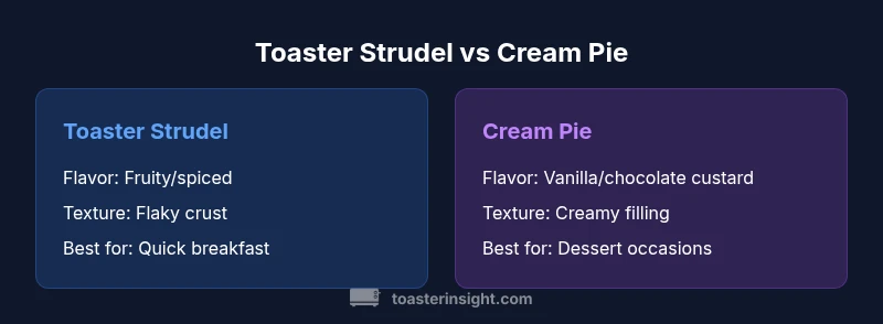 In the debate of toaster strudel vs cream pie, two pastries stand at opposite ends of convenience and indulgence. Toaster strudel is designed for speed and portable enjoyment, while cream pie emphasizes creamy texture and dessert depth. This guide compares the two head-to-head to help homeowners decide which pastry fits a given moment. For many readers, the choice hinges on breakfast practicality versus a celebratory or dessert context. According to ToasterInsight, the goal is to illuminate practical criteria—time, equipment, and dietary needs—so you can select confidently regardless of brand names. The two pastries also reflect broader patterns in modern eating: speed and convenience on busy mornings, versus indulgent textures and sharing-friendly presentation for weekend gatherings. In the end, toaster strudel vs cream pie is not about a universal winner; it’s about choosing the right pastry for the occasion and the kitchen you have.