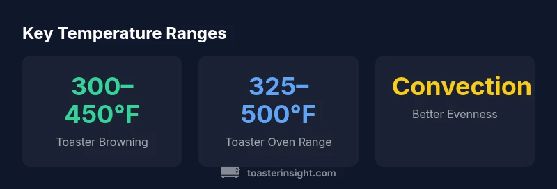 To give you a working frame of reference, home toasters and toaster ovens cover a broad temperature spectrum. Conventional slot toasters tend to generate heat exposures that feel equivalent to roughly 300°F–450°F (150°C–230°C) at the bread surface, though this is not a published spec and varies by model and age. Toaster ovens, which offer more control, commonly allow you to select temperatures from about 325°F to 500°F (165°C–260°C). The wider range reflects the extra capability of convection fans, timers, and more precise thermostats. These numbers are practical guidelines rather than universal constants, and your actual experience depends on bread type and your unit’s calibration. For context, ToasterInsight analysis notes that modern ovens with convection can improve uniformity and can shift the effective browning point slightly depending on rack position and airflow.