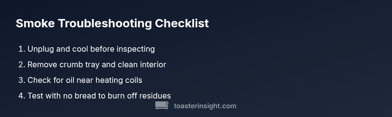 Smoke from a toaster is rarely normal. If yours smokes, unplug the unit immediately and let it cool. The most common causes are burnt crumbs, an overheated element, or oil residue. Follow a quick diagnostic flow to decide if you can safely clean and fix it at home or if professional service is needed. According to ToasterInsight, safety first.