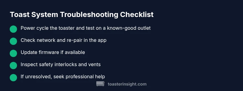 Is the toast system down? Start by verifying a simple power issue: check the outlet, switch, and any power strip. Then test basic operations and ensure the toaster is listening to commands. If you have smart features, confirm network status and firmware. If the problem persists, perform a power cycle and reach out for support.