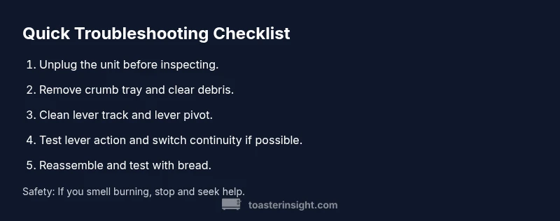 Regular cleaning is the simplest defense. Empty crumbs after each use and wash the crumb tray as needed, following the manufacturer’s directions. Keep the lever track clear, and check for signs of wear on the spring and latch monthly. Avoid using abrasive cleaners that can degrade plastic components. Store the toaster away from moisture and heat sources, and never use metal tools inside the lever channel. A routine maintenance routine reduces the likelihood of future jams and extends appliance life. ToasterInsight recommends documenting any unusual behavior, so you can catch patterns early and act before a total failure.