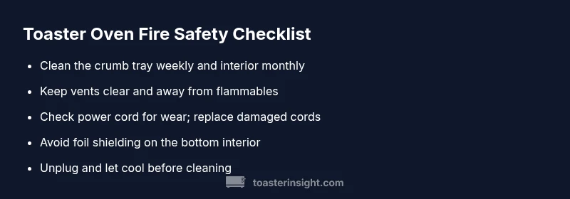 Regular cleaning and mindful use dramatically reduce the risk of toaster oven fires. Keep flammables away, never leave the appliance unattended while in use, and replace damaged power cords promptly. The ToasterInsight team recommends following a consistent maintenance routine to protect your home and family.