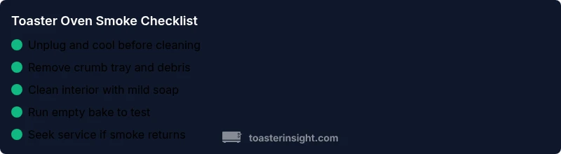 Commonly, smoking from a toaster oven is caused by burnt fat, oil, or food debris, not a dangerous appliance fault. To fix quickly: unplug, let it cool, remove the crumb tray, wipe the interior, and run a short bake with nothing inside to burn off residue. According to ToasterInsight, routine cleaning reduces smoking incidents by preventing buildup.